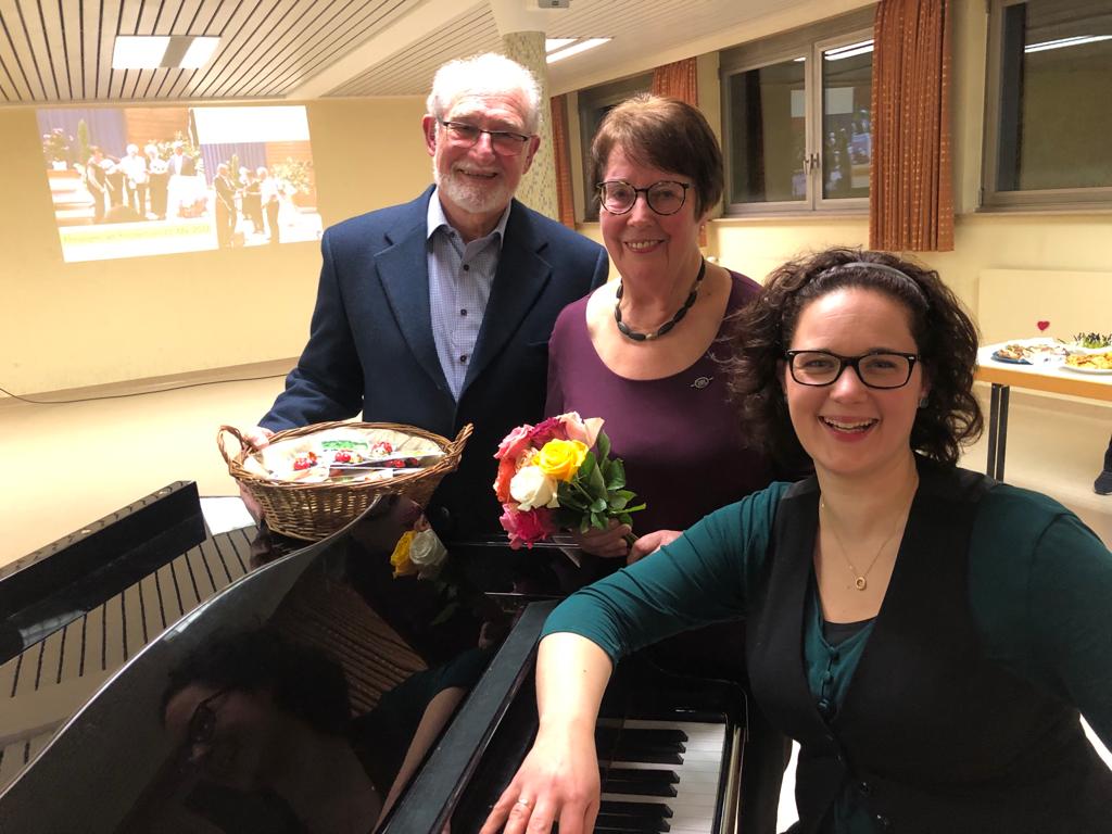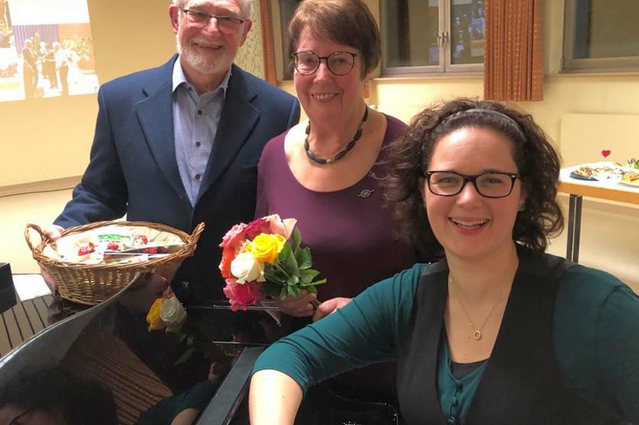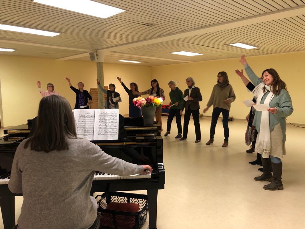Sie wurde von den Sängerinnen und Sängern für 20 Jahre 1. Vorstand geehrt und mit liebevoll gestalteten Geschenken bedacht. Die Vorstandskollegen überreichten eine prächtige Orchidee. Ein von den Chormitgliedern erstelltes Erinnerungsbuch, Rosen von den Choryfeen und Geschenke von Vertretern anderer Vereine drückte große Wertschätzung für Gertrud aus. Die allergrößte Überraschung aber waren heimlich einstudierte Lieder. Sabine Friedrich und Hassan Ahmida haben bekannte Lieder neu für Gertrud getextet. Begleitet auf dem Konzertflügel kamen sie zum Vortrag. Auch die Choryfeen sangen noch ein spezielles „Gertrudlied“. Gertrud war sichtlich gerührt, das hatte sie nicht erwartet.
