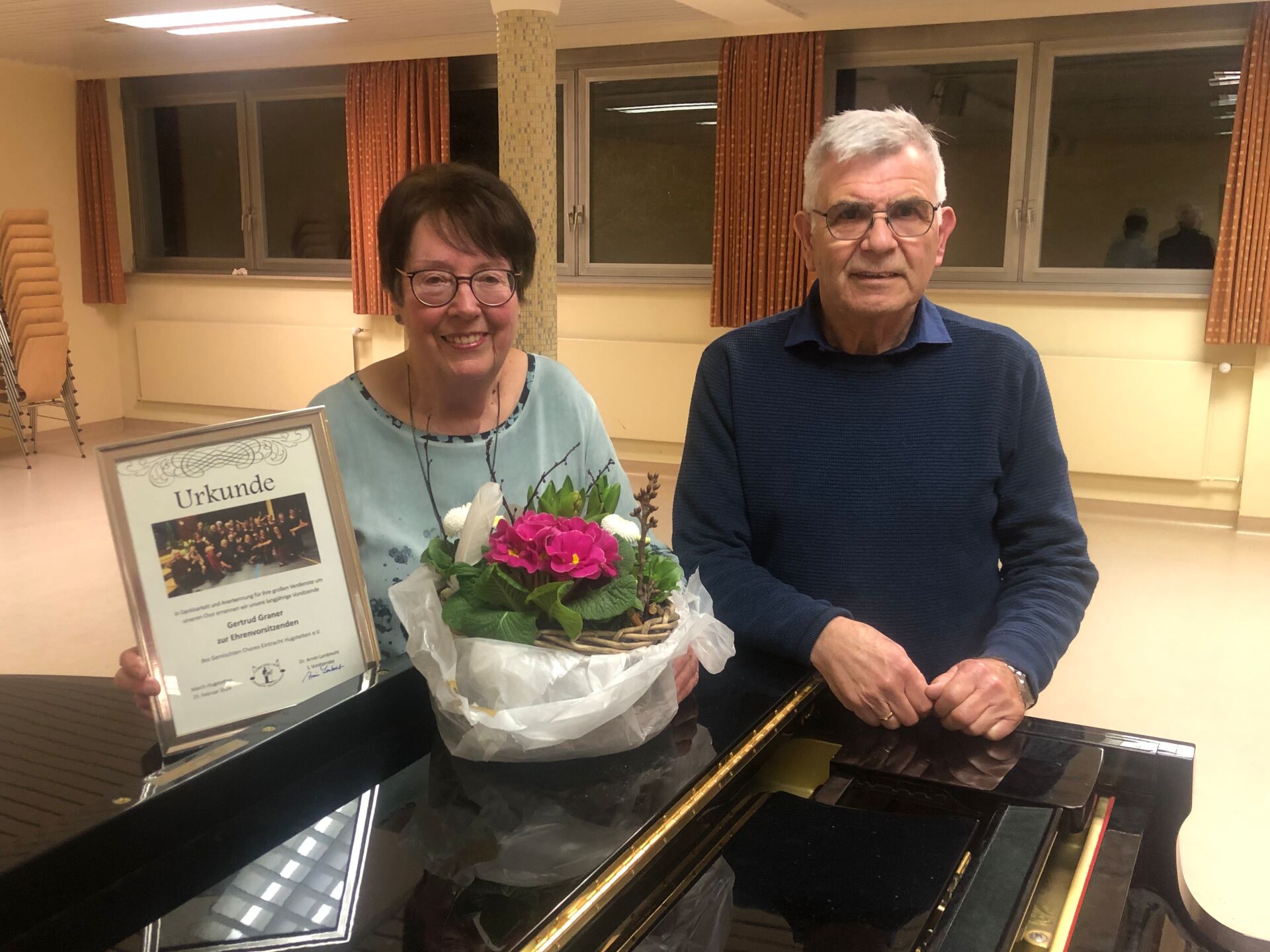 Am 23.2.24 fand unsere Jahreshauptversammlung statt. Neben Berichten standen auch Ehrungen an. Unsere ehemalige 1. Vorsitzende G. Graner wurde zur Ehrenvorsitzenden ernannt und war sichtlich erstaunt und gerührt. Nun haben neben unserem Ehrenvorstand W. Schill auch eine Ehrenvorsitzende. Unsere Chorleiterinnen gaben eine Vorschau auf 2024 und es wurde Ihnen für das abgelaufene Jahr gedankt. Es war eine schöne und harmonische Versammlung.