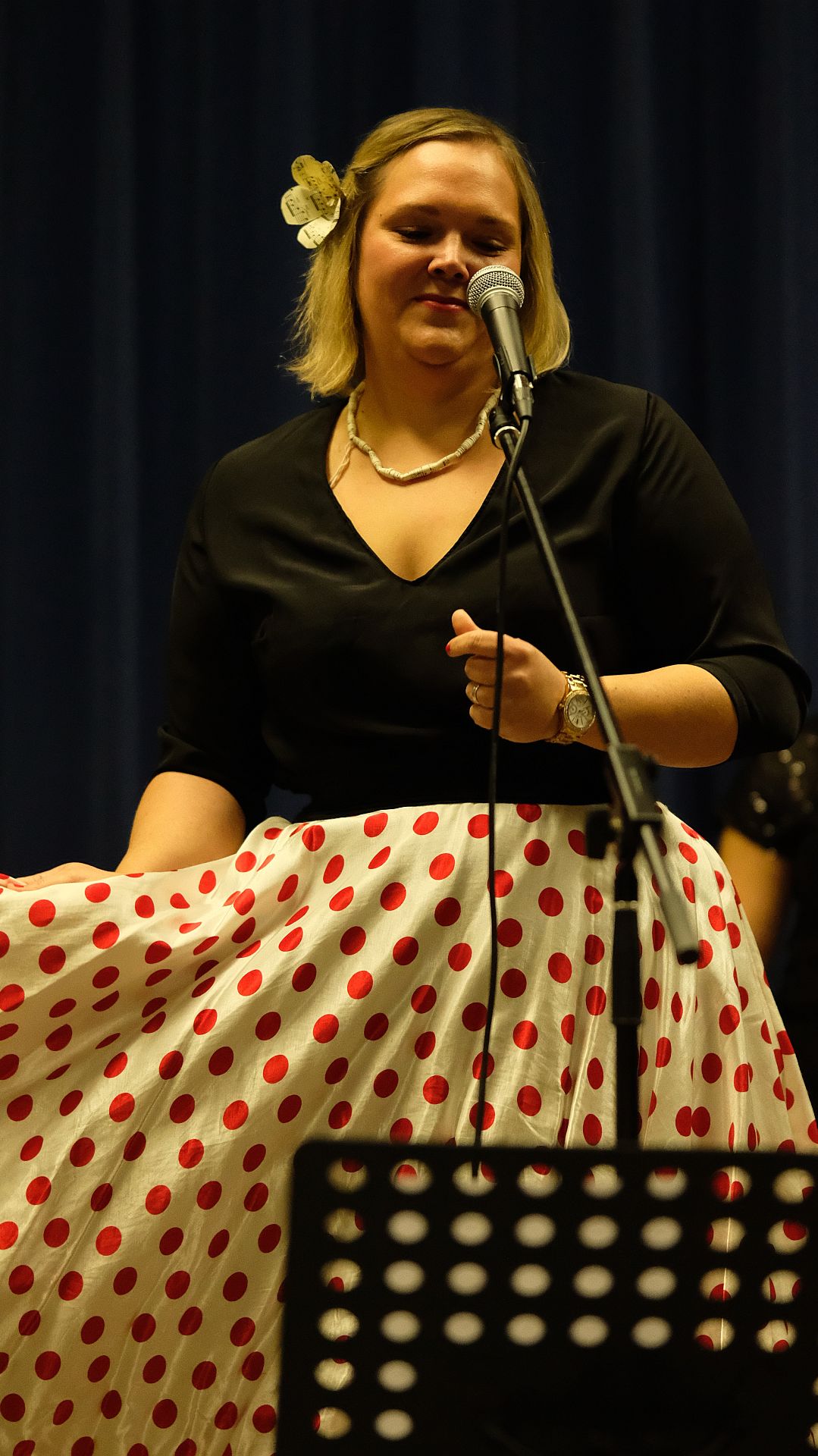 Mit großem Applaus wurde danach vom Publikum eine neue Fassung des Titelsongs „My Heart Will Go On“ aus dem Film „Titianic“- aufgenommen. Sie wurde mitreißend im Stil der 50’er Jahre von der Solistin Maike Ochsendorf mit Amely Heim und Veronika Hofmayer im Background vorgetragen.