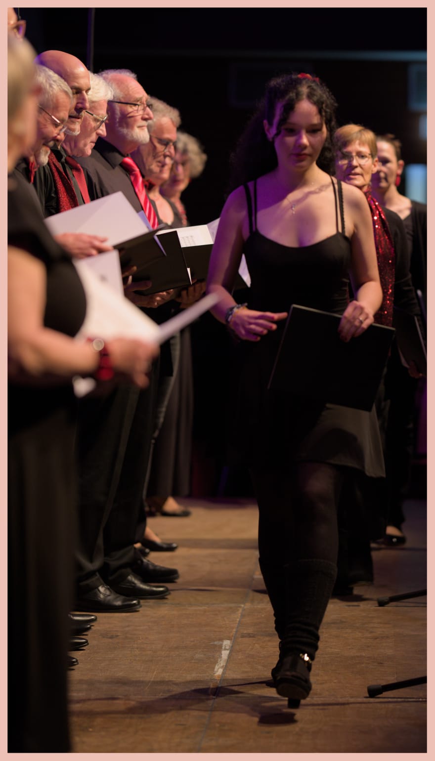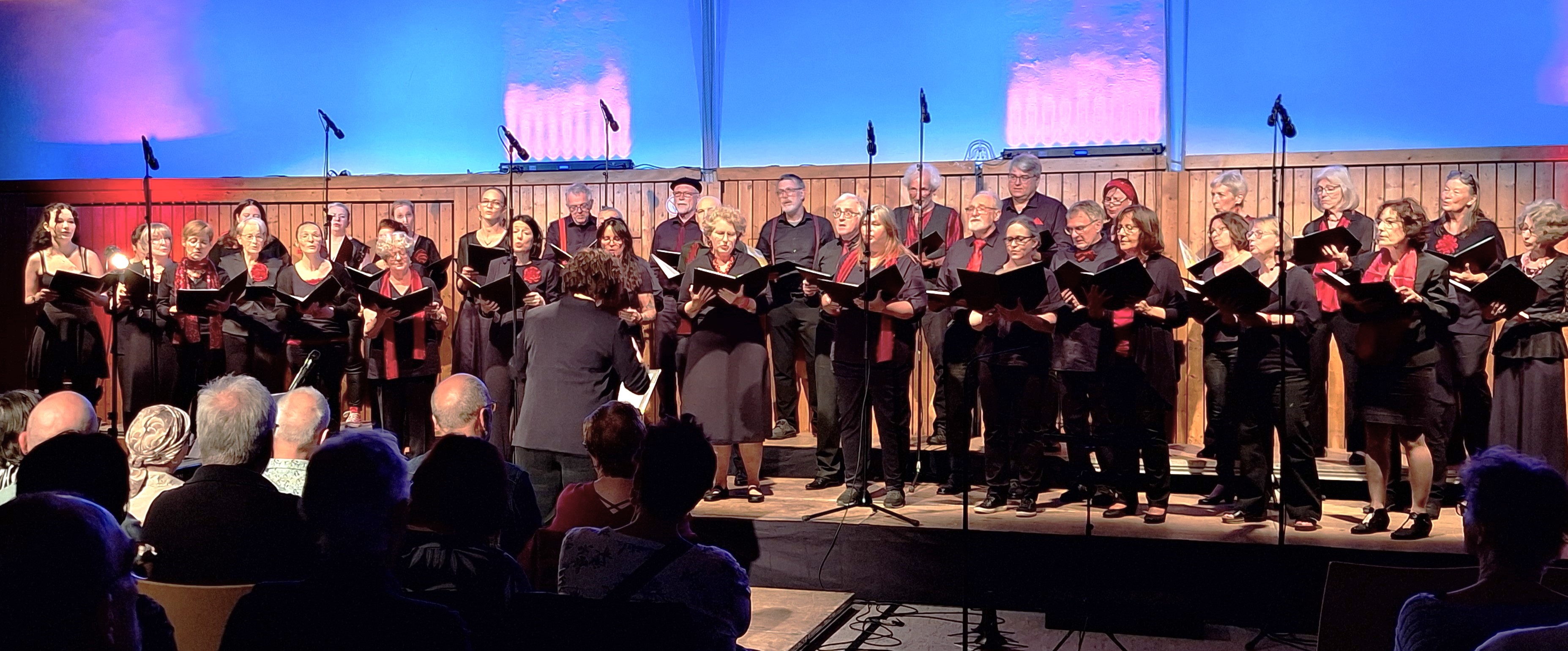 Anschließend betrat erneut Chor'n more die Bühne und begeistert das Publikum mit vier wundervollen Liedern, darunter das bekannte „Heal the World" (Michael Jackson). Am Ende gesellten wir uns zu Chor'n more auf die Bühne, rückten eng zusammen und sangen gemeinsam mit über 90 Sängerinnen und Sängern „Don't stop me now" – eine Klangexplosion und der krönende Abschluss eines unvergesslichen Abends!