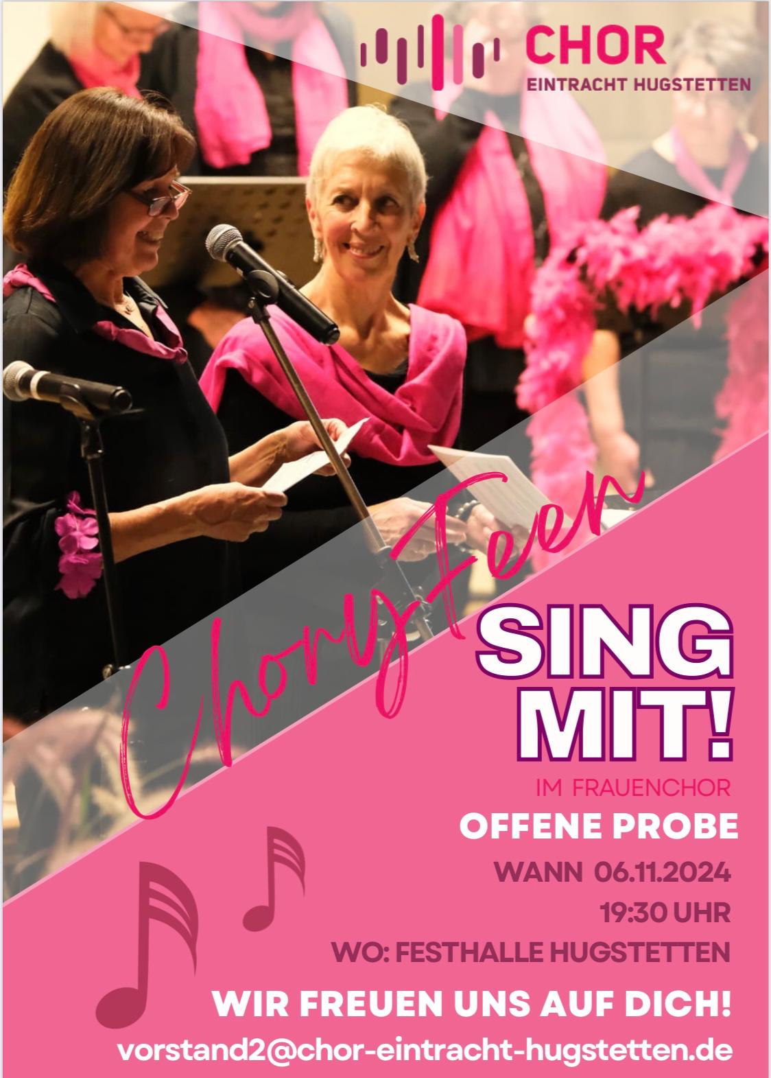 Nach unserem Wunschkonzert zusammen mit dem Gemischten Chor am 12. Oktober haben bestimmt einige Zuhörerinnen Lust bekommen, mal bei uns vorbei zu schauen und mit uns zu singen. Wir sind ein Frauenchor ChoryFeen und würden gerne neue Sängerinnen in unseren Reihen aufnehmen.