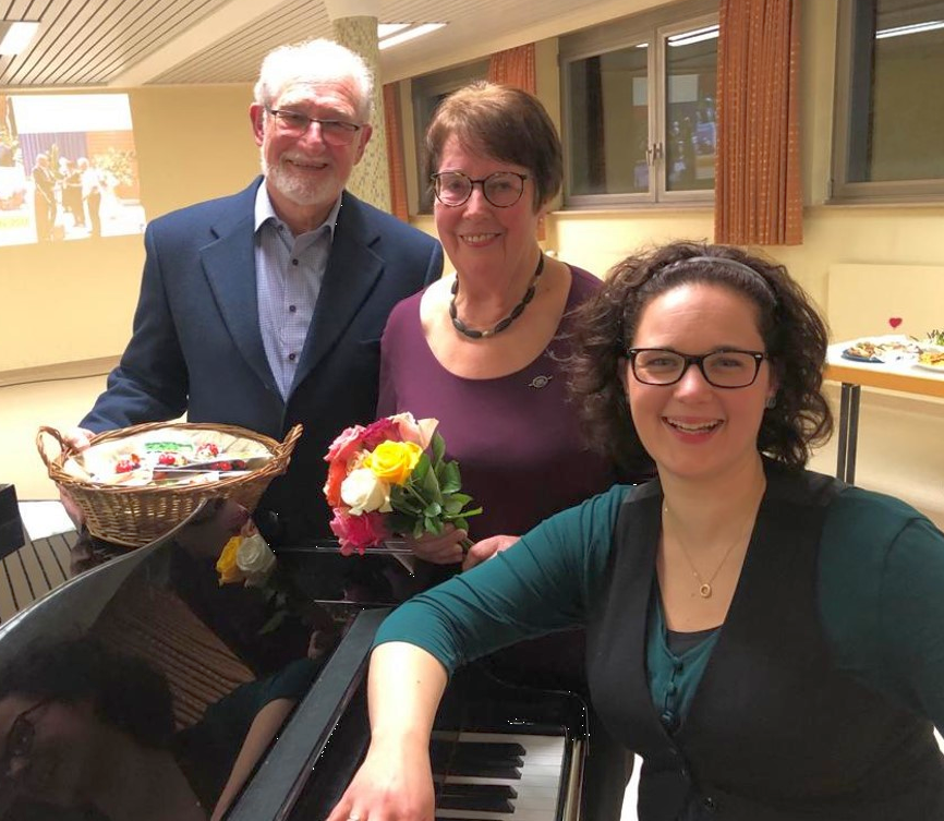 Sie wurde von den Sängerinnen und Sängern für 20 Jahre 1. Vorstand geehrt und mit liebevoll gestalteten Geschenken bedacht. Die Vorstandskollegen überreichten eine prächtige Orchidee. Ein von den Chormitgliedern erstelltes Erinnerungsbuch, Rosen von den Choryfeen und Geschenke von Vertretern anderer Vereine drückte große Wertschätzung für Gertrud aus. Die allergrößte Überraschung aber waren heimlich einstudierte Lieder. Sabine Friedrich und Hassan Ahmida haben bekannte Lieder neu für Gertrud getextet. Begleitet auf dem Konzertflügel kamen sie zum Vortrag. Auch die Choryfeen sangen noch ein spezielles „Gertrudlied“. Gertrud war sichtlich gerührt, das hatte sie nicht erwartet.