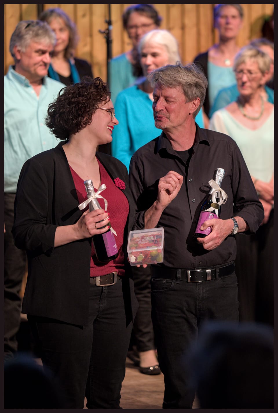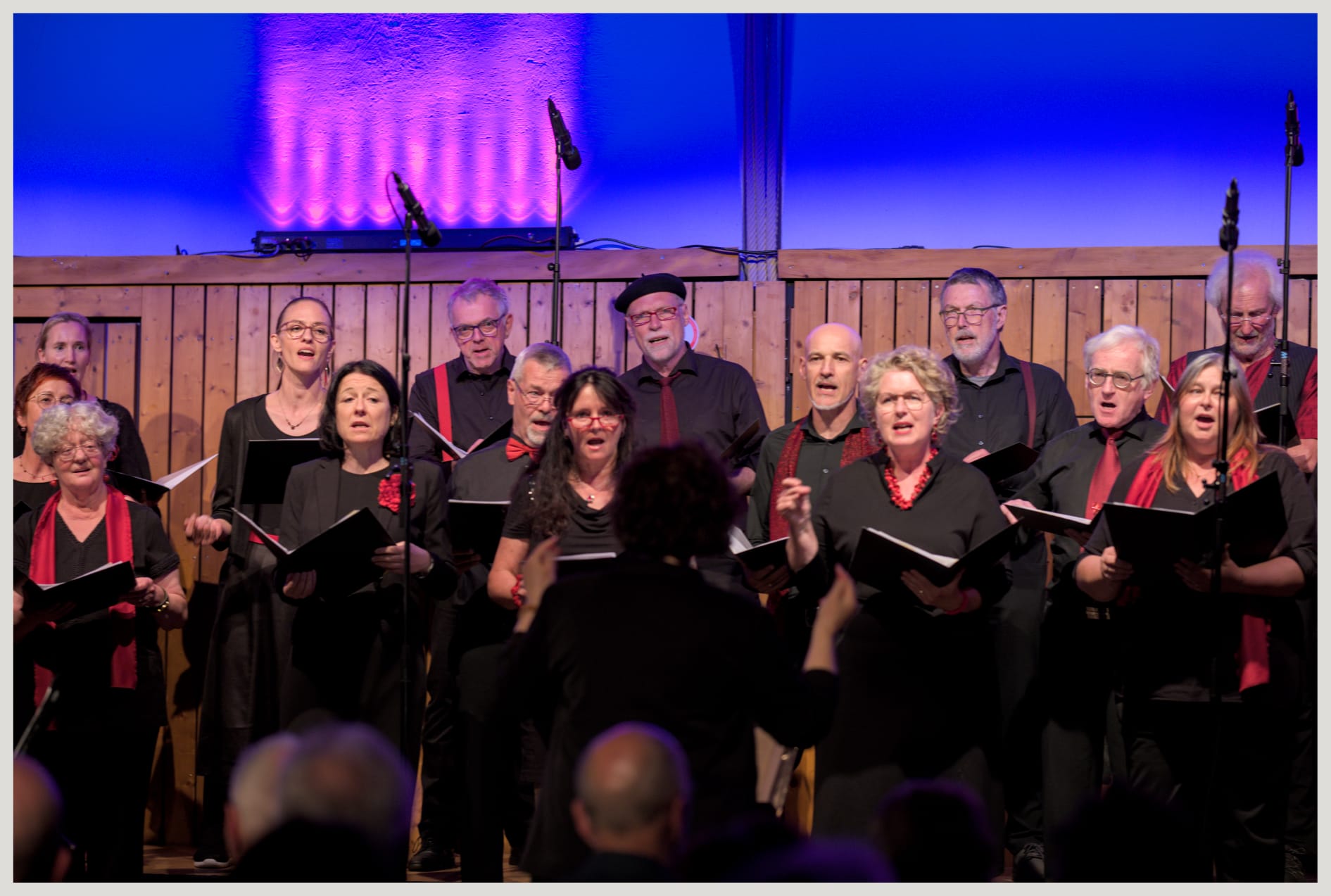 Anschließend betrat erneut Chor'n more die Bühne und begeistert das Publikum mit vier wundervollen Liedern, darunter das bekannte „Heal the World" (Michael Jackson). Am Ende gesellten wir uns zu Chor'n more auf die Bühne, rückten eng zusammen und sangen gemeinsam mit über 90 Sängerinnen und Sängern „Don't stop me now" – eine Klangexplosion und der krönende Abschluss eines unvergesslichen Abends!